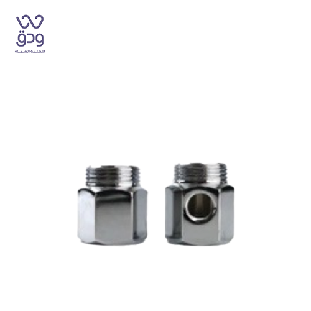 وصلة خلاط مزدوج من ودق هي جلبة من طرف ذكر و الطرف الثاني انثى و لها مكان من المنتصف لتركيب محبس ربع بوصة الذي يوصل عليه خرطوم الفلتر الابيض