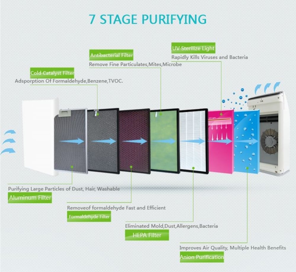 - يحتوي على العديد من التقنيات المتطورة لتنقية الهواء، مثل فلتر HEPA عالي الكفاءة وفلتر الكربون الفعال والمحفز البارد والأشعة فوق البنفسجية وغيرها، والذي يساعد على تحسين جودة الهواء وتنقيته بشكل فعال.